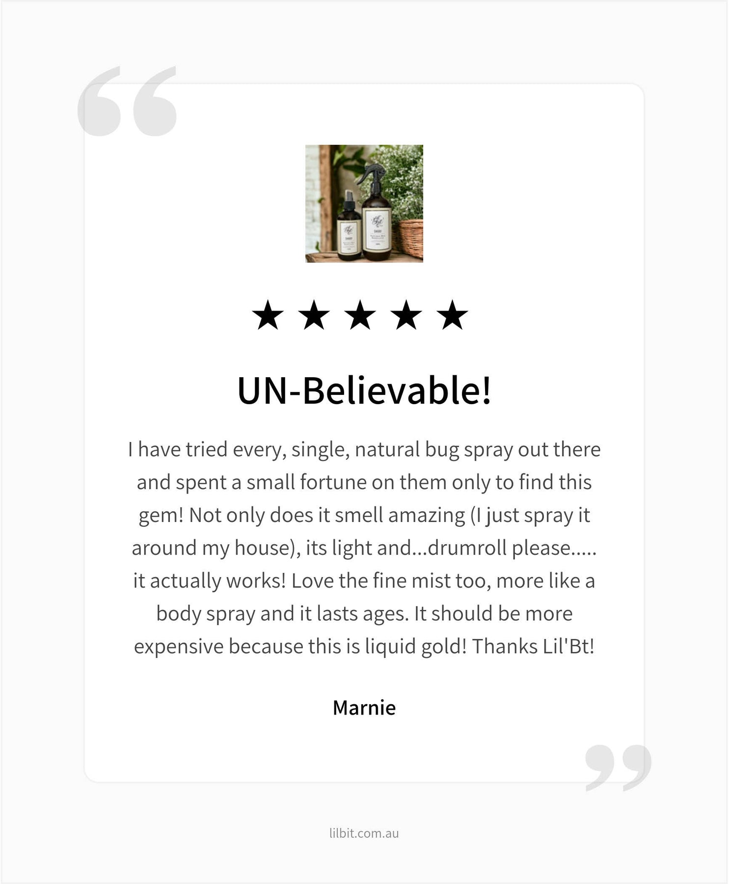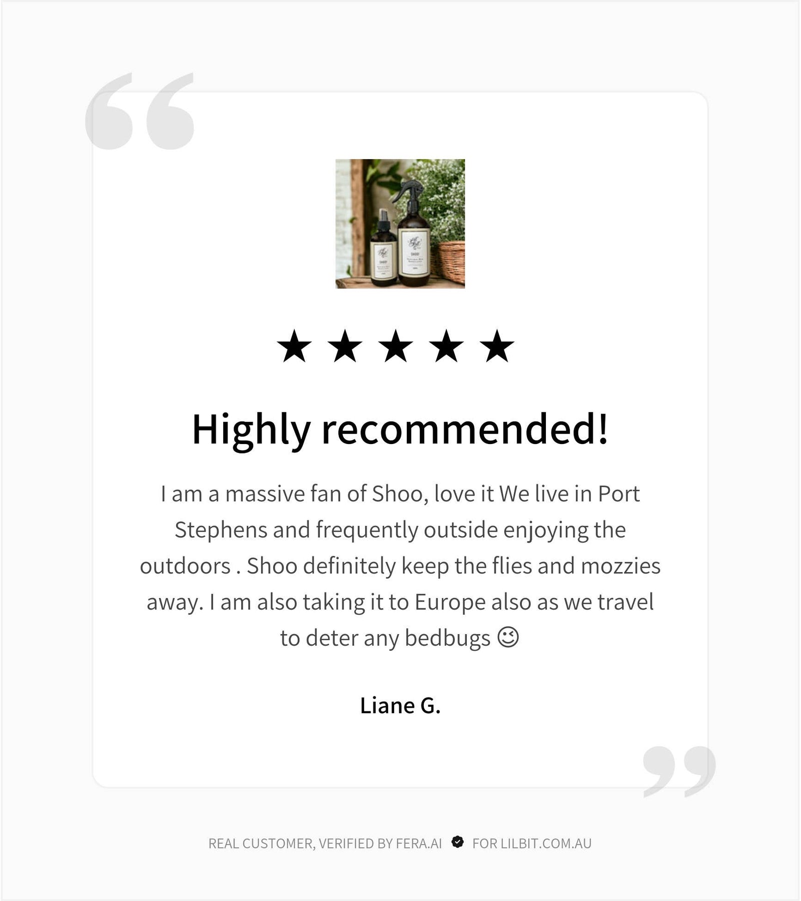 Enjoy outdoor activities this summer with this Australian handmade, gentle yet effective organic mosquito, midge and fly repellent. A mix of woody, citrus and floral notes combine to make a summer perfume with a purpose - no chemical smells here! Shoo! spray is safe enough to use on children and babies and can even be applied to the face. It's also sold to many of Australia's luxury resorts, retreats holiday parks and into Asia.