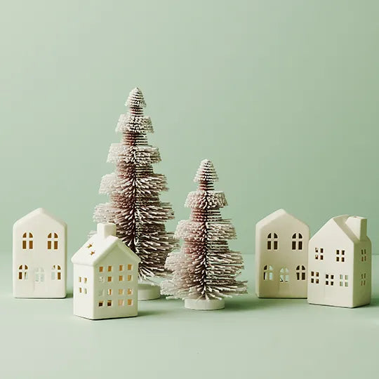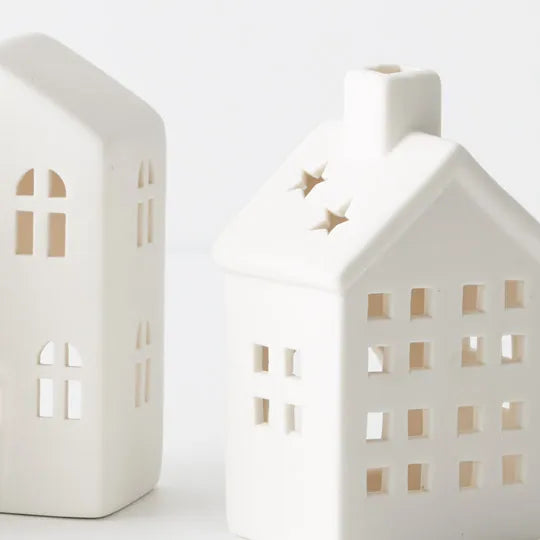 Create a charming winter scene with our Set of Three Little White House Candle Holders. These miniature village dwellings add a touch of whimsy and warmth to your holiday decor, each house designed to hold a flickering candle, casting a cozy glow.