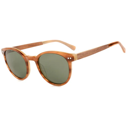 Lugo Round Wood Sunglasses – Two-Tone Amber Acetate & Walnut Hybrid Eyewear