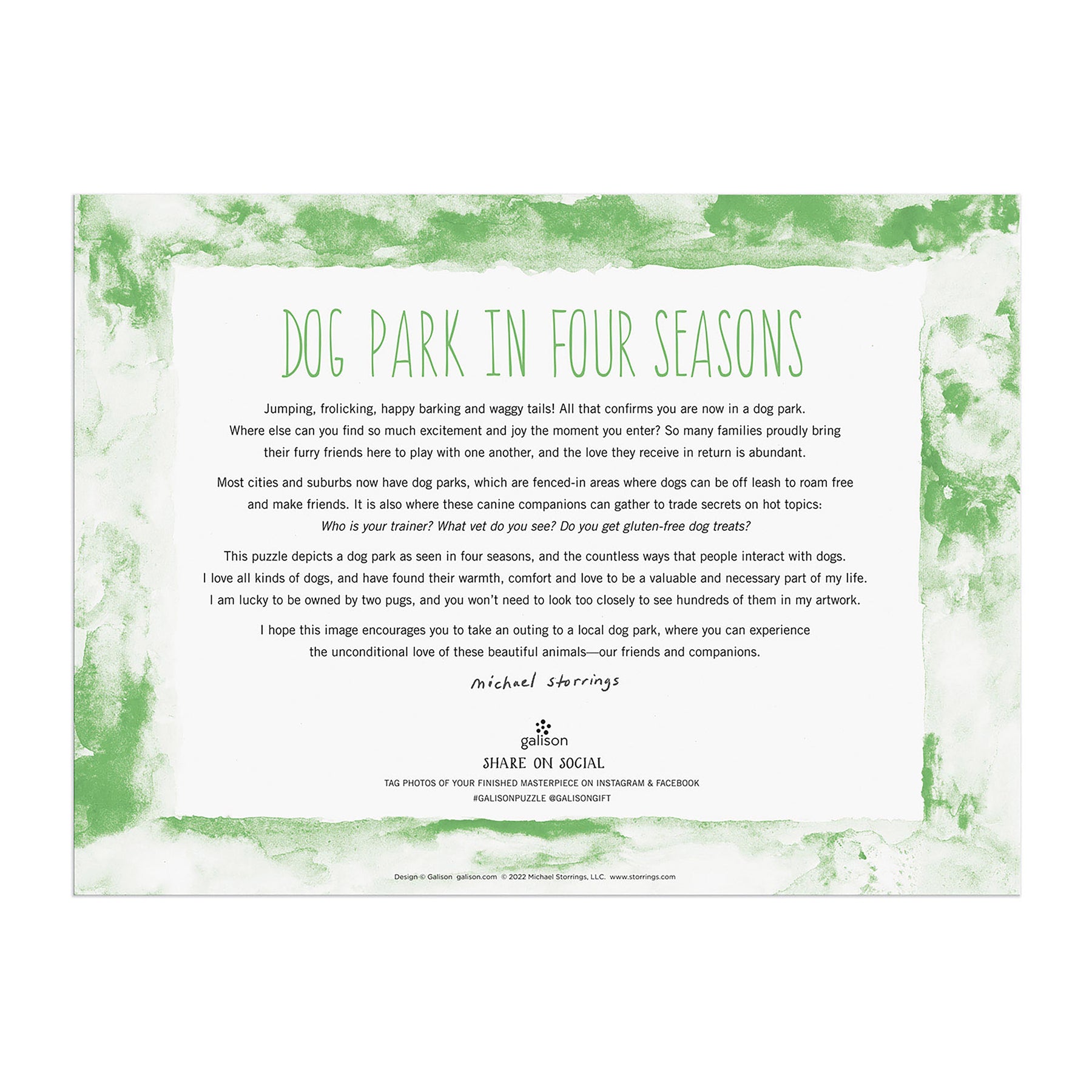 Regular price $39.95 Save $-39.951,000 PIECE PUZZLE – The Michael Storrings Dog Park in Four Seasons 1000 Piece Puzzle from Galison is just the right amount of challenging and fun for a few days of activity.